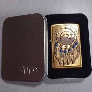 As pictured. Used in excellent condition, Zippo #20433 "Dreamcatcher". Solid brass with embossed front emblem. May require a new flint. Original metal box included.