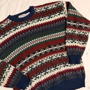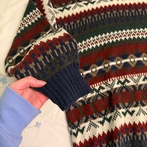 Gorgeous knit grandpa-style longsleeve sweater in a cool abstract design. Colours are red, blue, green, white, tan and grey! Cuffs and collar are blue.