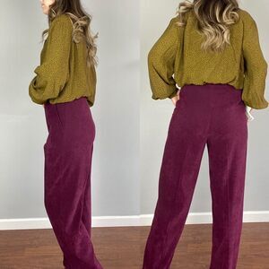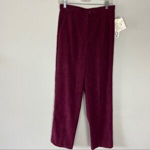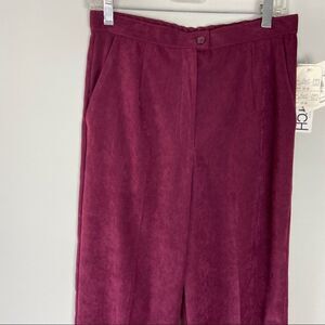 Vintage dead stock high waisted burgundy trousers pants. Straight leg with slight barrel cut. Material has almost a soft faux suede texture. Koret brand. The tag states stretch fabric but it’s not really stretchy to today’s standards.