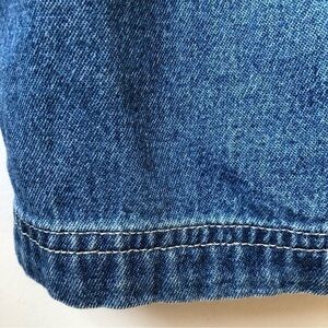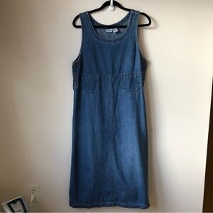 Denim pinafore midi dress can be worn alone or over a top. Round neck. Buttons on sides. Patch pockets on front. 100% cotton. Preowned and in great condition