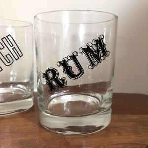 Vintage lowball liquor glasses that say, GIN, SCOTCH, and RUM. All in excellent condition with no chips or cracks. From a pet friendly and smoke free home.