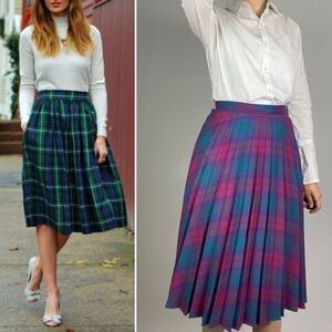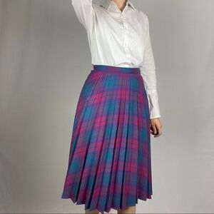 VINTAGE plaid wool pleated a line midi skirt. Teal pink purple. Union label.