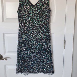 Beautiful dress, with black slip, and the sequined material over top. Sequins are clear that reflect silver, blue, and green aqua colours.