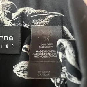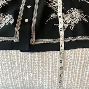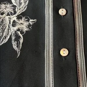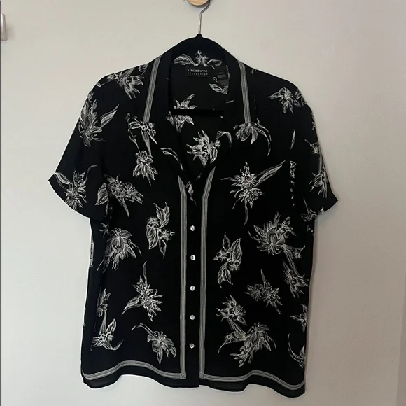Stylish black button-up shirt with white floral patterns. Perfect for casual or formal occasions. Beautiful quality silk in pristine condition