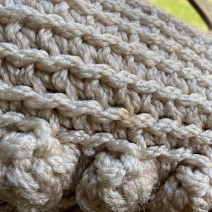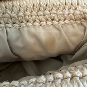 Nice vintage knit purse with wood handles featuring bird and floral motif. There are no rips or tears in the fabric. A couple of small stains on inner liner and one on outside which likely can be removed with a spot clean. The wood handles have a couple of cracks but still totally functional. There are no tags or branding on this purse. Approx. 14.5" wide, 10" long (not including handles) and 4.25" across at base.