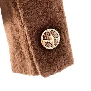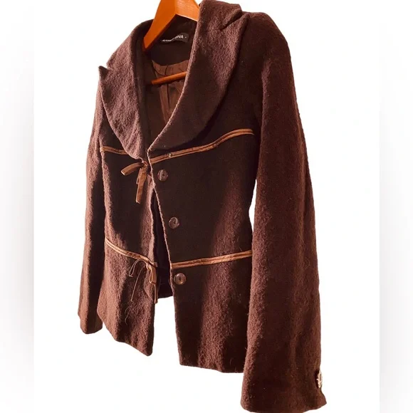 Vintage wool jacket with satin piping and bows. Scoop neck with hidden buttons and snap closure. Decorative buttons on cuffs.