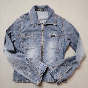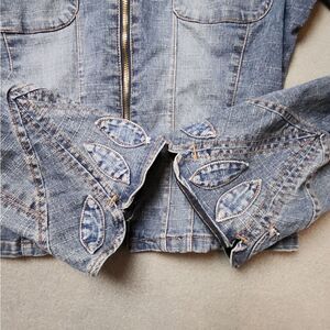 Gorgeous vintage Bongo jean jacket with zipper closure. applique jean leaves on the bell style sleeves, back and front.
