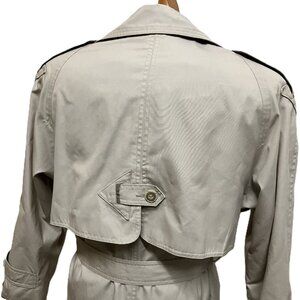 Vintage VIPetites classic trench coat in a neutral stone beige color. Button details at shoulders, back yoke, and sleeve cuffs. Has matching removable belt. Pockets at hips. 65% polyester/35% cotton outer fabric, 100% polyester lining, Machine washable. Tag "4 Petite", see below for garment measurements. Pre-owned condition: bottom hem has a few faint discolorations along edge (see close-up photos).