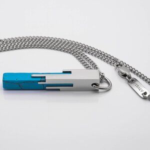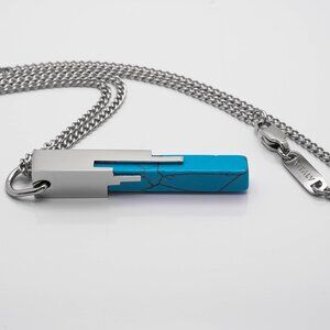 Features a block of synthetic blue marble enclosed in a sleek casing that resembles digital artifacts and pixelation. Made of stainless steel which won't rust, tarnish or turn your skin green!