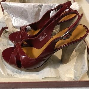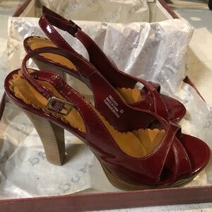 Step out into style with these formal fashionable burgundy red tan high heels, women’s size 5 1/2.