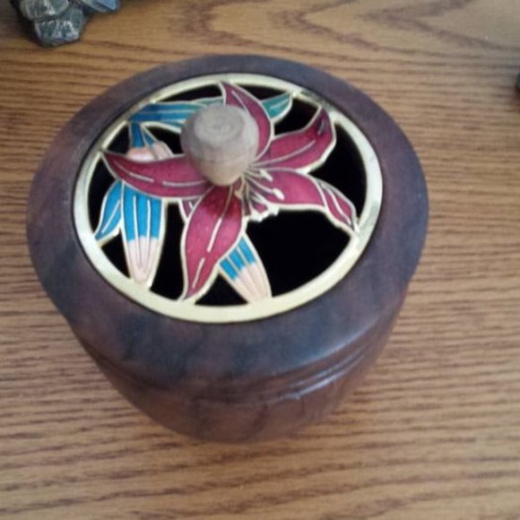 I suspect this is from India mainly due to the fine detailing and hand painted brass lid. So cute, this rich wooden base container is perfect to keep all sorts of goodies in it. Beautiful woodgrain finished to a satin finish. Light weight. I don't recognize the wood grain. but it is lovely and adorable!