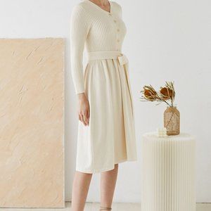 V-NECK BOWKNOT WAIST BUTTONED KNIT DRESS IN CREAM