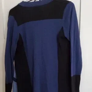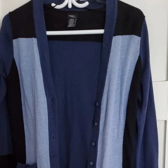 Navy blue, blue, and black V-neck cardigan by Haggar. Size Petite X-Sm. Fabric is 60% cotton, 40% polyester.