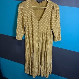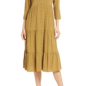 Embrace effortless style with this Madewell sundress, featuring a tan hue and a tiered, ruffled design. The dress boasts a smocked waist for a flattering fit, complemented by 3/4 sleeves and a crew neck, making it perfect for casual or work settings.