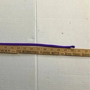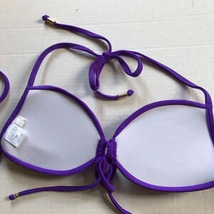 Size medium, vibrant bright purple with a white liner. Ties up around your neck and in the back. Made in USA. The straps are approx 20” in length.