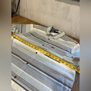 Casual short-sleeve button-up shirt featuring horizontal stripes in shades of grey, blue, white, and taupe. Chest pocket with small logo tag. Soft and lightweight fabric. Classic collar. New with tags. Size XL.