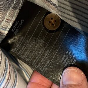 Casual short-sleeve button-up shirt featuring horizontal stripes in shades of grey, blue, white, and taupe. Chest pocket with small logo tag. Soft and lightweight fabric. Classic collar. New with tags. Size XL.