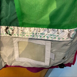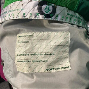 VOLCOM Omega Gor-Tex V-Line Science Hooded Snow 06 Recco Short Snow Coat Jacket. Sz XS. Hot pink. Magnetic buttons. Zipper garage. Hood with hard front (baseball cap like). 2 tiny holes hem (not visible when wearing) and 1 other (as pictured). Pull tabs on the hood and lots of pockets. Two way Velcro on adjustable wrist cuffs.