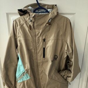 VOLCOM jacket with tan exterior and green lining. Includes a hood and pockets.