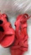 a pair of red sandals, likely made of leather, with multiple straps forming a crisscross design over the foot and an ankle strap