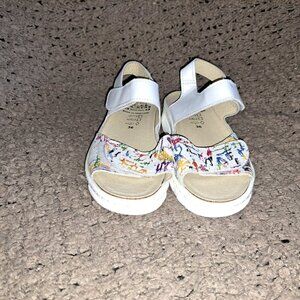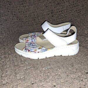 The product is a pair of VOLKS WALKERS women's sandals in size 36/6, featuring a white leather design with paint splatter pattern. These stylish and comfortable sandals have a low wedge heel, double hook and loop strap closure, and are perfect for casual or travel occasions.