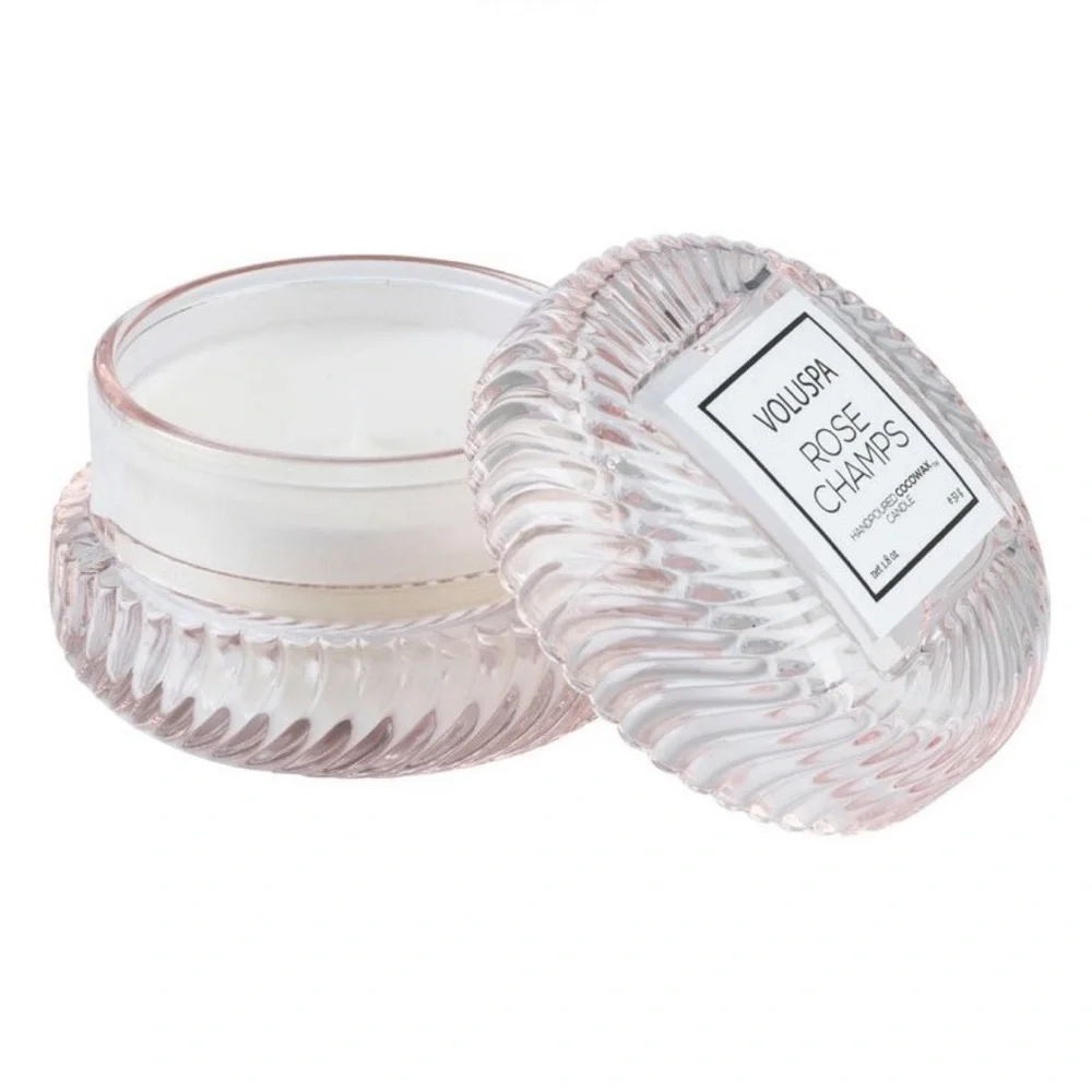 Rose Champs: Brut Rose Champagne, Sugared Rose Petals 1.8 oz of fragrant macaron flavor inspired COCOWAX fills a delicately colored glass jar shaped like a macaron cookie. The Macaron Collection glass is textured with a soft swirl pattern and colored to match the cookie that served as fragrance and packaging inspiration. Stack them, pile them up, always use more than one because who’s counting?