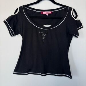 This vintage-style T-shirt features unique cut-out details on the shoulders and back, giving it an edgy, fashion-forward look.