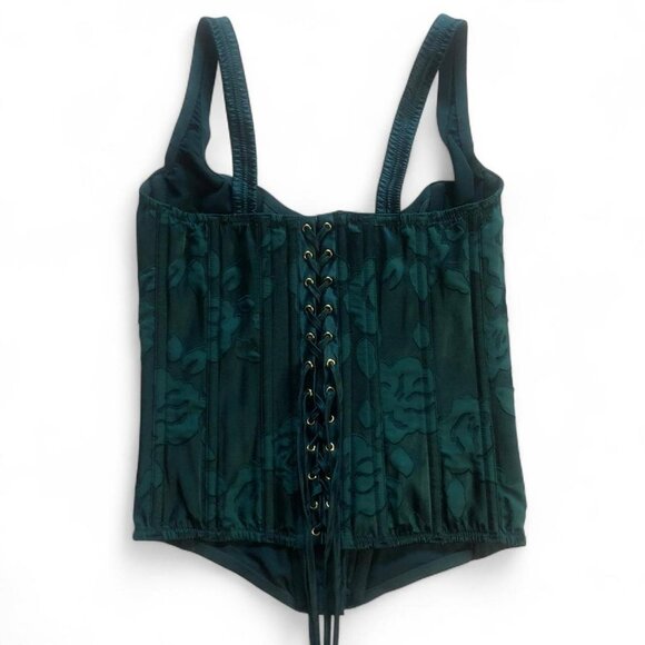₊˚⊹⋆beautiful VICTORIA'S SECRET ARCHIVES REWIND TO THE FUTURE floral brocade jewel-toned teal burnout satin-like hook-eye lace-up corset top⋆˚࿔