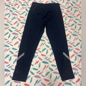 Stylish navy blue leggings featuring silver accents. Perfect for any workout or casual outing.