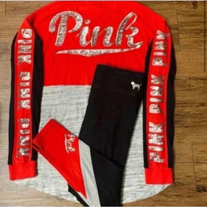 VS PINK RED COLORBLOCK BLING SHIRT/ LEGGINGS OUTFIT S