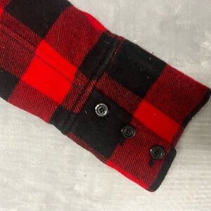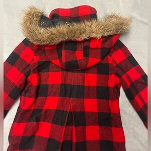 Stylish red and black plaid peacoat. Features a detachable faux fur hood. Double-breasted design with button details. Removable hood
