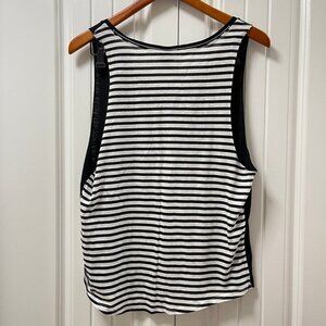 Stay cute and comfy in this bold VS PINK tank top. Featuring a colorblock design with a black front and striped back, this relaxed fit tank is great for lounging or layering. The striped front pocket adds a playful touch to the graphic "PINK" lettering.