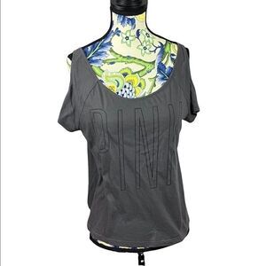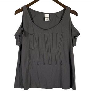 Cute VS PINK cold shoulder top. Perfect for the days you are just chilling at home. Grey with black outline PINK logo. Very small hole mid back on left side as shown in pictures.