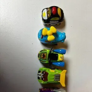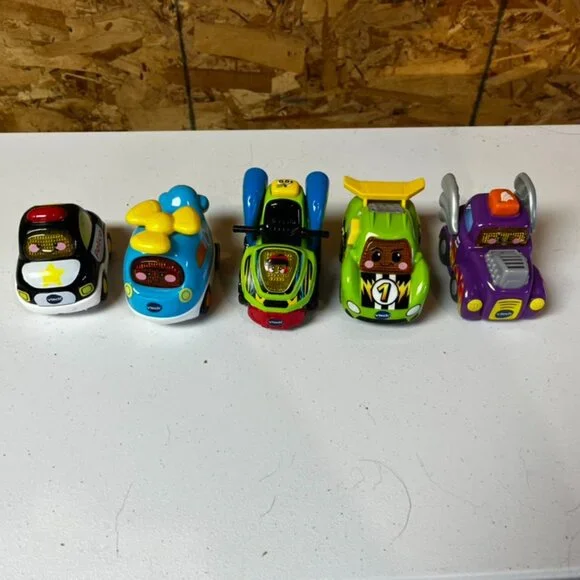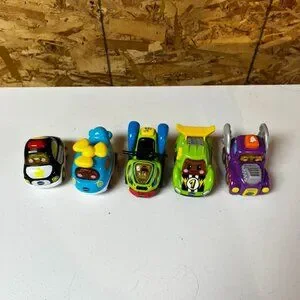 These are 5 V-TECH Cars for kids. There is a variety of the cars. Only used by one child and it too old for them now. They have batteries in them.