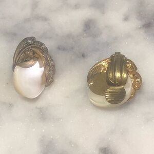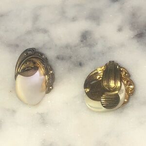 VTG 1940s Triad Mother of Pearl & Marcasite Clip On Earrings .4”