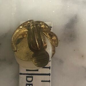 Round mother of Pearl disc with Marcasite studded leaves curving around the centrepiece. Clip on style earrings , measure just under a half inch (.4”)