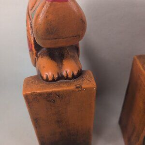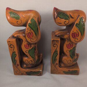 Elevate your bookshelf with a touch of vintage charm. These great pre-owned used condition ceramic bookends from Arnart Creations feature an adorable dachshund design, complete with a vibrant orange hue and delicate rose floral accents. The item may have minimal wear / markings due to age. Please see photos for more details.