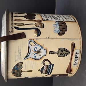 Vintage Baret Ware,Somerset biscuit barrel/tin with leather wrapped handle, features Jewel-tone kitchen motifs.
