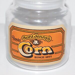 VTG 1980 T.K.C. Aunt Jenny's Poppin Corn 6" Glass popcorn Storage Jar Canister
