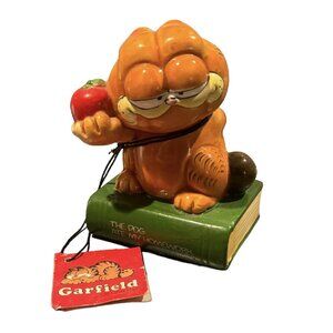 This vintage Garfield ceramic figure is part of the Garfield Gift collection released in 1981 in collaboration with Enesco. It comes with its original tag and is still in good standing condition considering its age. It can be a nice little touch on a desk, shelf or any rooms in your house. Why not even at work! The saying written on the green book correspond nicely to Garfield personality. Ah yes...“The Dog Ate My Homework”. Get your hands on it today!