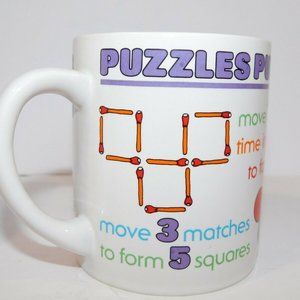 This hard to find Vintage 1985 Applause MUGS AT PLAY Thinking Puzzles Mug & Coaster Set is in Great Bright clean barely used condition with original box (box does have some marks, small rip from storage and a faded writing on To and From spots on top). **NOTE There is a small tiny speck / spot above word Puzzle in 2nd photo that is from original production. Mug features 3 Different brain puzzles and Coaster features answers to the Puzzles. Mug measures 3.75" in height and 3.25" in diameter at