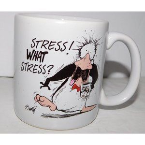 This Vintage 1994 Opus n' Bill STRESS! WHAT STRESS? Coffee Mug is in Great clean bright condition. Mug measures 3.5" tall and 3.25" in diameter at opening.