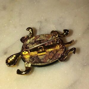 Vtg 70s Black Oval Glass Gold Tone Turtle Brooch w Rhinestone Eyes 1.5”