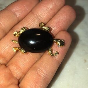 VTG 70s Black Oval Glass Gold Tone Turtle Brooch w Rhinestone Eyes 1.5”