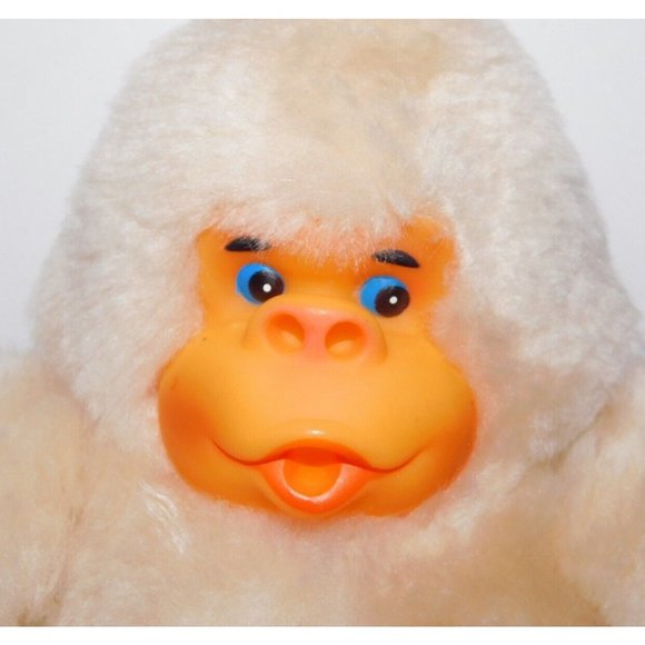 This Very Hard to Find Vintage 70s GORGEOUS GEORGE 10" Cream Thumb Sucking Gorilla is a Canada Trust Exclusive Made in Taiwan is in Great clean displayed condition tush tag still attached at the rear. Banana on right hand has 2 little spots of paint wear - see all photos. Face, ears and hands and feet are all hard plastic - body is plush fur stuffed body with nut shells.