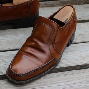 1970s Florsheim venetian slip-on dress shoe, men's size 8 D in natural tan burnished leather (high heat polished to look almost like patent, much more durable and resistant finish). Made in Canada.