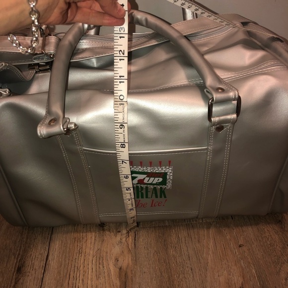 Good vintage condition vinyl (?) metallic silver 7-up duffel bag, double zipper, locking clasp, long and short straps.