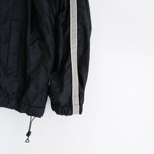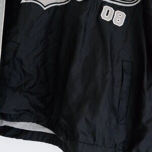 Crafted from durable **nylon with a comfortable lining**, this windbreaker offers lightweight protection against the elements. The **pullover design** and **adjustable hem** ensure a cozy fit, while the bold black and gray color scheme adds a sleek, sporty look. Whether you're at the game, out for a walk, or running errands, this jacket keeps you stylish and comfortable.