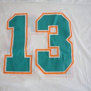 Step into NFL history with this vintage '95 Starter Miami Dolphins Dan Marino #13 football jersey. Featuring the iconic white and teal color scheme, this jersey honors one of the league’s greatest quarterbacks, Dan Marino. The bold number “13” and Starter branding add to its authentic vintage appeal, making it a must-have for Dolphins fans and collectors alike.