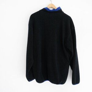Crafted from soft, cozy fleece, this sweater is perfect for cooler days, offering both warmth and a relaxed fit. The **half-zip design** adds versatility, making it easy to layer or wear on its own for a casual, sporty look. The rich **navy blue color** and classic branding make it a standout piece for any vintage enthusiast or pop culture collector.